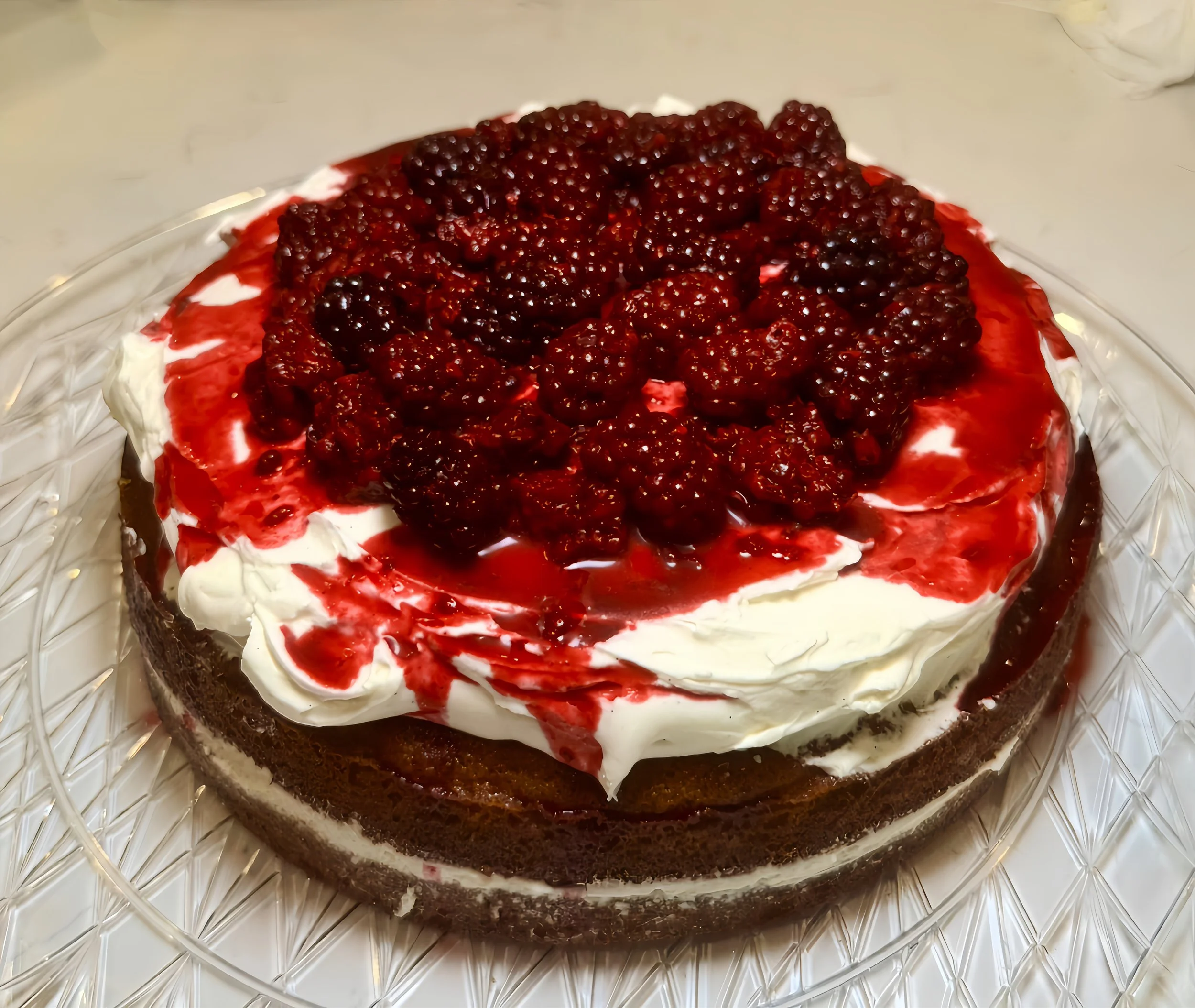 Lemon Olive Oil Cake with Lemon Curd, Fresh Whipped Cream, and Blackberry Compote