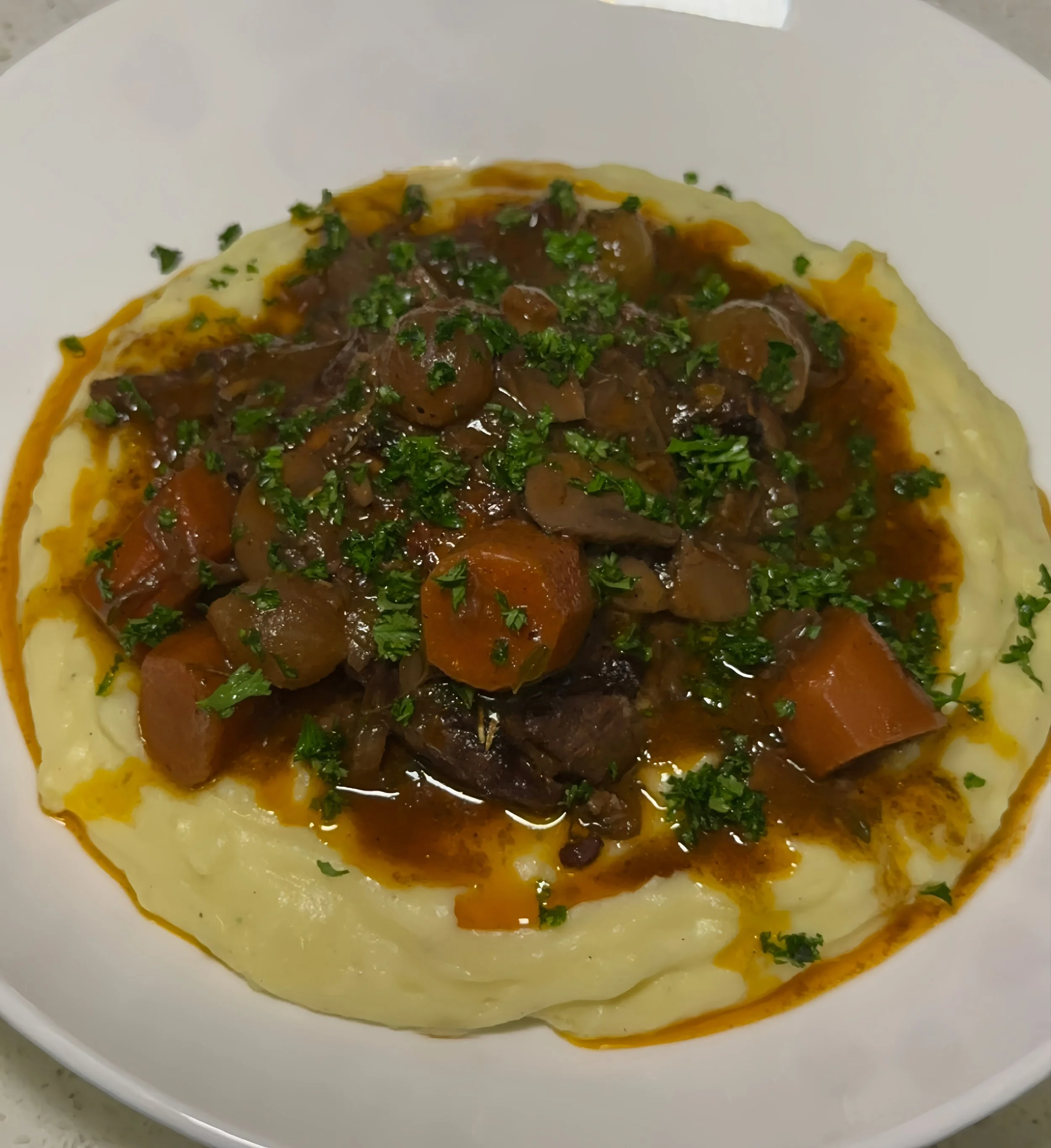 NY Strip Steak over Roasted Garlic Whipped Potatoes