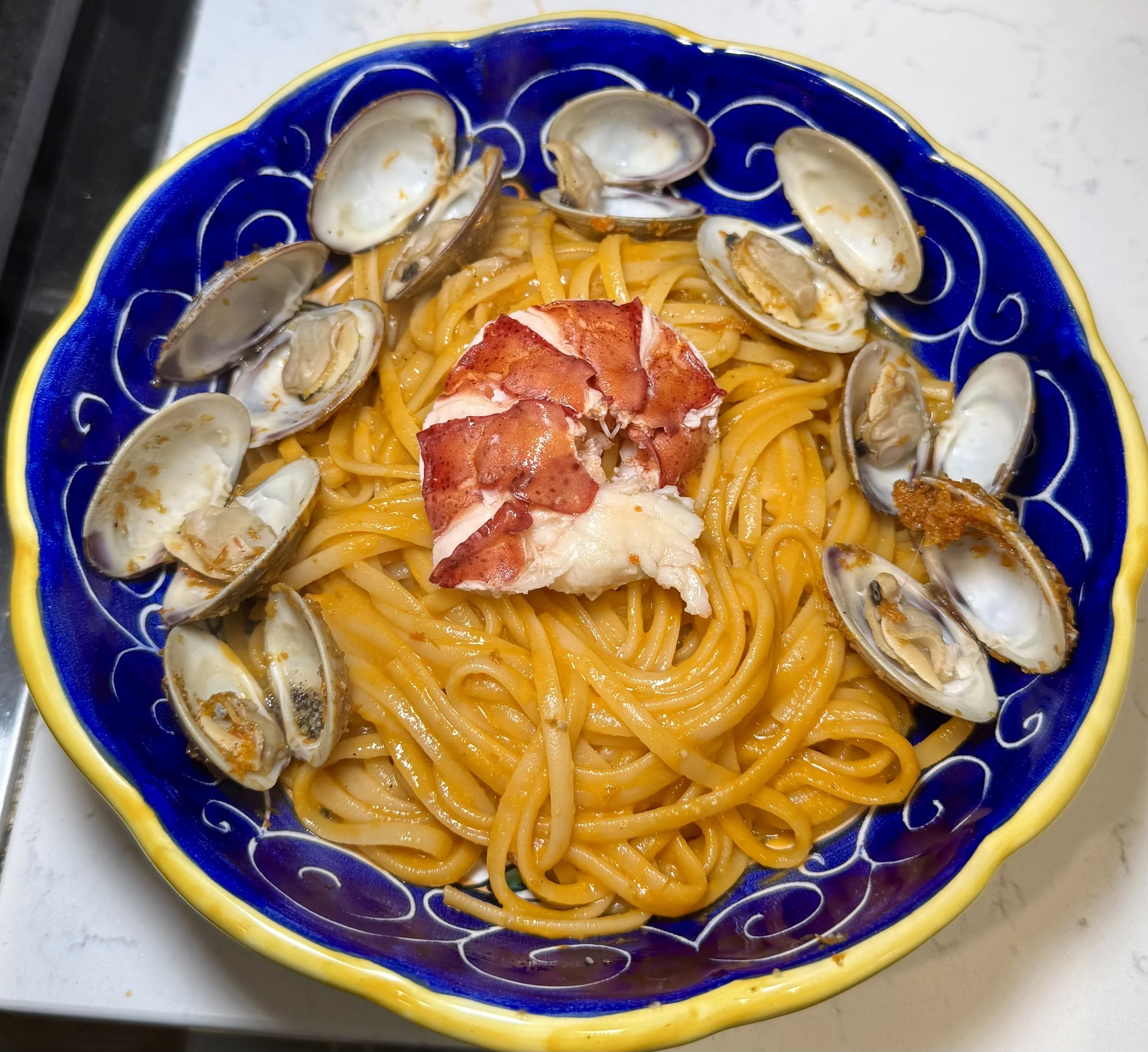 Linguine in a white wine, cherry tomato sauce with clams & lobster
